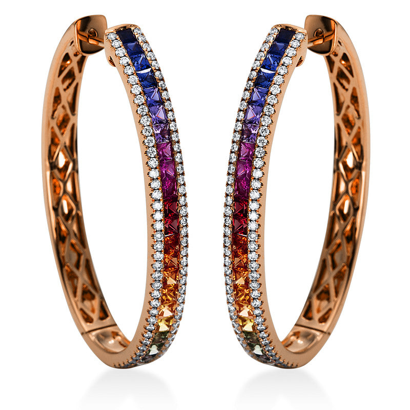 Creolen 18 kt RG. 160 Brillanten 0.75 ct. TW-si. 46 Saphire 2.53 ct multicolor. H:39.1 mm. B:26.9 mm. S:4.2 mm