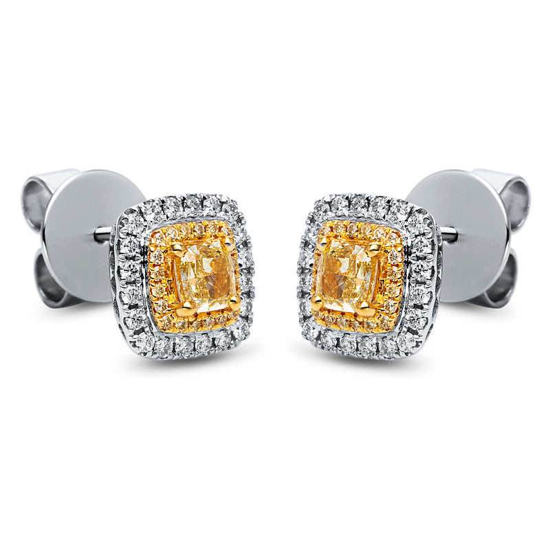 Ohrstecker 18 kt WG+GG, 40 Brill. 0,30 ct, TW-si, 2 Cushion 0,69 ct, gelb, 40 Brill. 0,11 ct, gelb