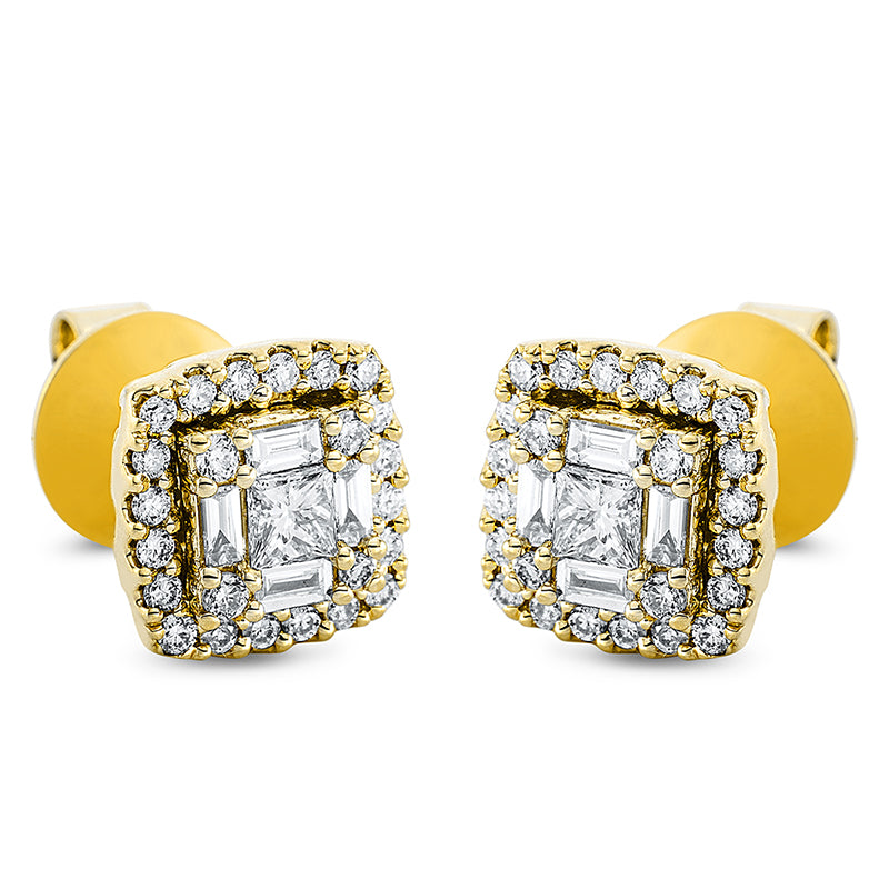 Ohrstecker 18 kt GG. 8 Baguette 0.14 ct. TW-si. 2 Princ. 0.17 ct-si. 48 Brillanten 0.31 ct. TW-si. H:8.5 mm. B:8.5 mm. S:3.9 mm