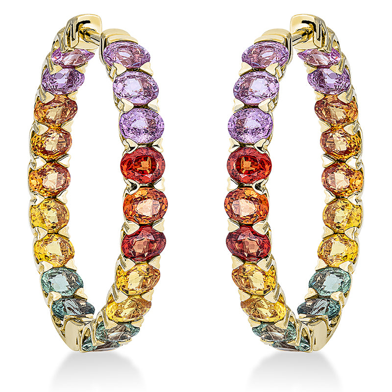 Creolen 18 kt GG. 160 Brillanten 0.98 ct. TW-si. 32 Saphire 5.83 ct fancy. H:22.2 mm. B:20.9 mm. S:7.1 mm