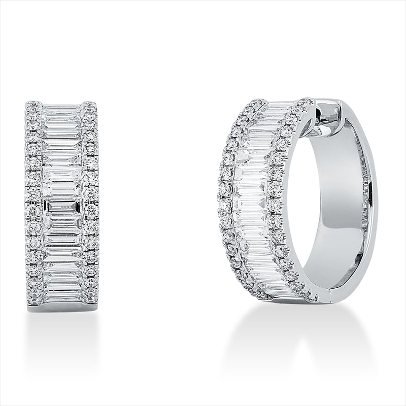 Creolen 18 kt WG, 36 Bag. 1,66 ct, TW-si, 68 Brill. 0,53 ct, TW-si