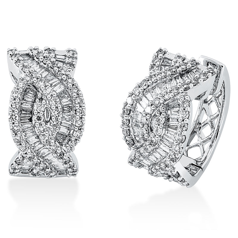 Creolen 18 kt WG, 30 Bag. 0,23 ct, TW-vsi, 41 Trap. 0,40 ct, TW-vsi, 104 Brill. 0,68 ct, TW-si