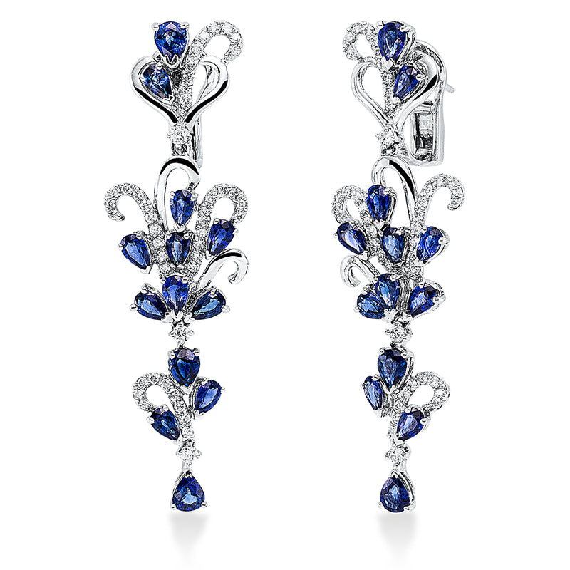 Ohrschmuck 18 kt WG. 6 Brillanten 0.24 ct. TW-vsi/si. 82 Brillanten 0.94 ct. TW-vsi/si. 26 Saphire 7.14 ct blau. H:59.8 mm. B:17.1 mm. S:5.0 mm