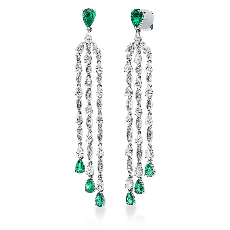 Ohrschmuck 18 kt WG. 34 Tropfen 2.49 ct. TW-si. 74 Brillanten 0.25 ct. TW-si. 2 Smaragde 0.81 ct grün. 6 Smaragde 1.07 ct grün. H:62.5 mm. B:8.1 mm. S:2.8 mm