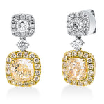 Ohrschmuck 18 kt GG+WG. GIA2437855743.GIA7431825607. 2 Cushion 4.20 ct. gelb-vs1. 28 Brillanten 1.00 ct. TW-si. 32 Brillanten 0.59 ct. gelb. H:22.6 mm. B:10.9 mm. S:5.1 mm