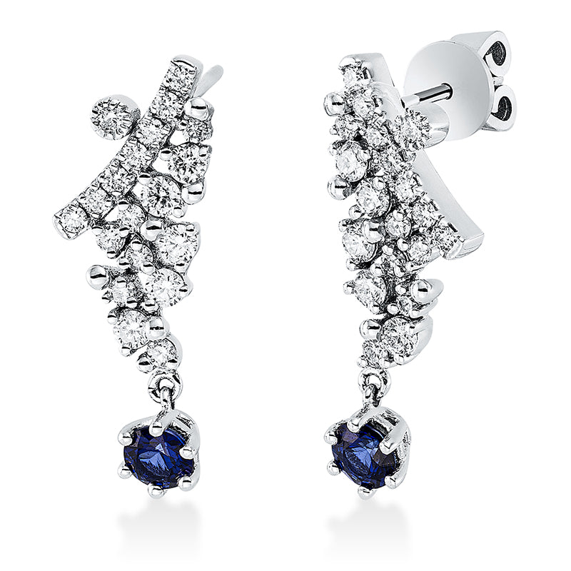 Ohrschmuck 18 kt WG, 10 Brill. 0,41 ct, F-si, 28 Brill. 0,40 ct, F-si, 2 Saphire 0,58 ct blau