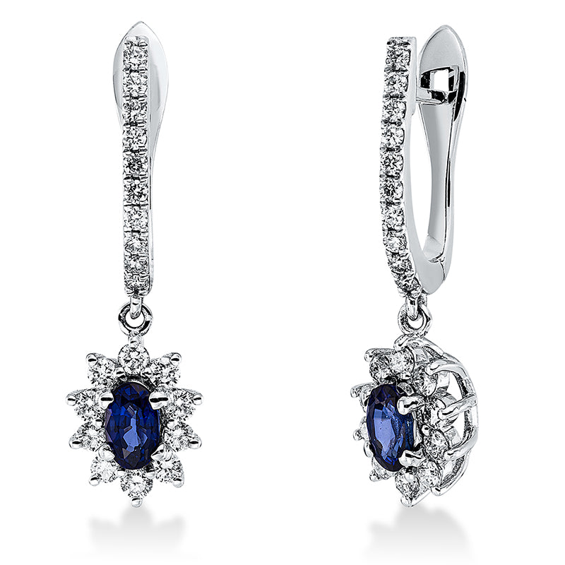 Ohrschmuck 18 kt WG. 20 Brillanten 0.44 ct. F-si. 20 Brillanten 0.20 ct. F-si. 2 Saphire 0.75 ct blau. H:27.4 mm. B:7.6 mm. S:5.5 mm