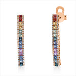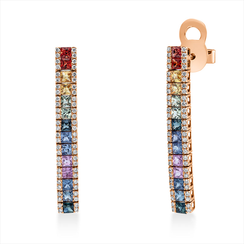 Ohrschmuck 14 kt RG. 6 parts shorter. 112 Brillanten 0.48 ct. TW-si. 28 Saphire 2.10 ct fancy. H:30.3 mm. B:3.8 mm. S:2.4 mm