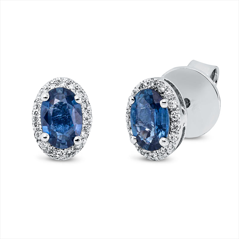 Ohrstecker 18 kt WG. 36 Brillanten 0.11 ct. TW-si. 2 Saphire 1.24 ct blau. H:7.7 mm. B:5.7 mm. S:3.5 mm