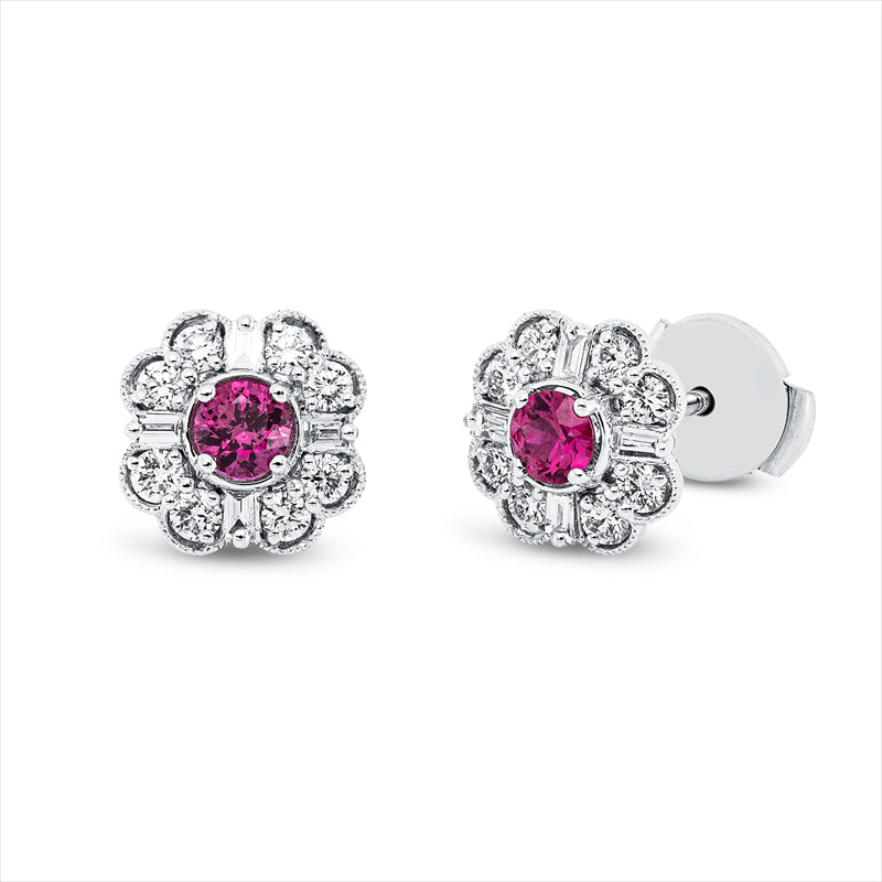 Ohrstecker 14 kt WG, 8 Trap. 0,17 ct, TW-vsi, 16 Brill. 0,50 ct, W-si, 2 Rubine 0,54 ct rot