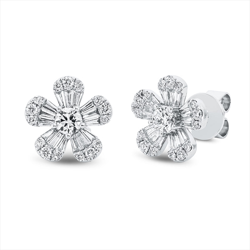 Ohrstecker 18 kt WG Blume. 2 Brillanten 0.35 ct. TW-si. 30 Trapeze 0.50 ct. TW-si. 30 Brillanten 0.26 ct. TW-si