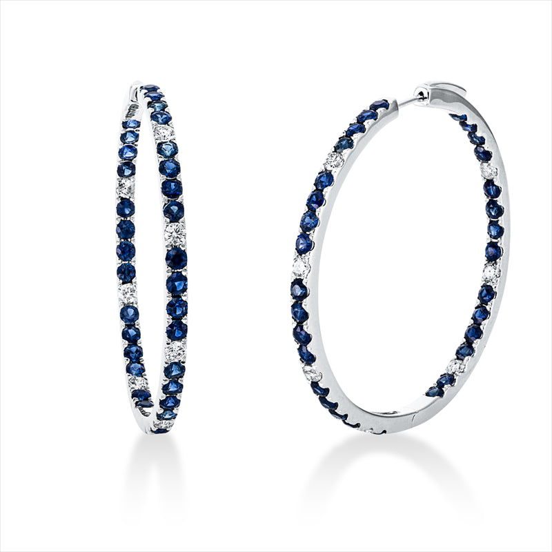 Creolen 18 kt WG. 14 Brillanten 0.72 ct. TW-si. 62 Saphire 3.85 ct blau. H:40.3 mm. B:40.2 mm. S:2.4 mm