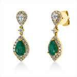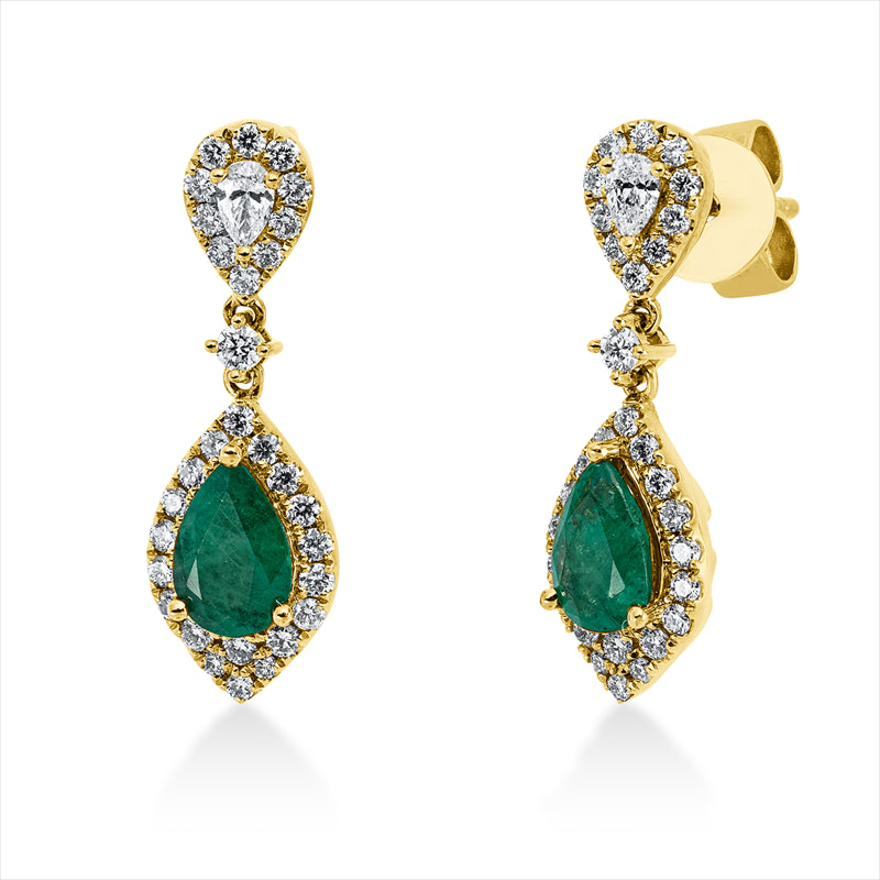 Ohrschmuck 18 kt GG Tropfen. 2 Brillanten 0.03 ct. TW-pi. 2 Tropfen 0.08 ct. TW-vsi. 58 Brillanten 0.31 ct. TW-pi. 2 Smaragde 0.66 ct grün