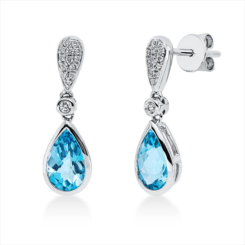 Ohrschmuck 14 kt WG, 28 Brill. 0,13 ct, TW-si, 2 Topase 2,17 ct blau