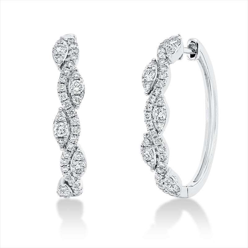 Creolen 14 kt WG. 10 Brillanten 0.37 ct. F-vsi/si. 70 Brillanten 0.47 ct. F-vsi/si. H:24.3 mm. B:25.2 mm. S:4.8 mm