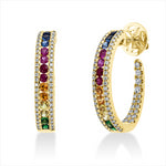 Creolen 18 kt GG. 128 Brillanten 0.90 ct. TW-si. 4 Saphire 0.21 ct pink. 6 Saphire 0.30 ct blau. 4 Tsavorith 0.18 ct grün. 4 Rubine 0.20 ct rot. 8 Saphire 0.42 ct gelb. H:25.9 mm. B:18.4 mm. S:4.6 mm