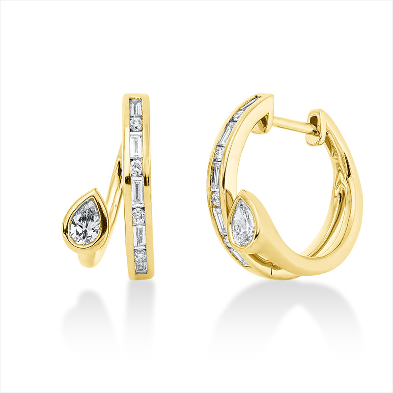 Creolen 18 kt GG, 10 Bag. 0,26 ct, F-vsi/si, 2 Tropfen 0,23 ct, F-vsi/si, 8 Brill. 0,06 ct, TW-si