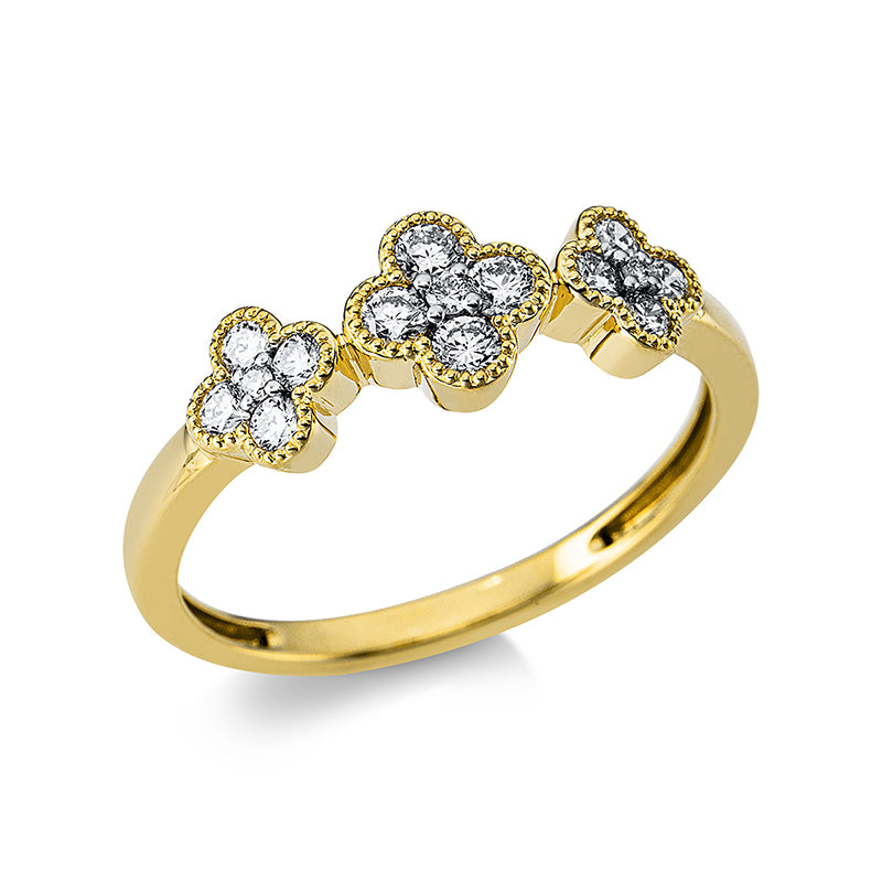 Ring 18 kt GG. Fassung rhodiniert. 1 Brill. 0.01 ct. TW-si. 8 Brillanten 0.21 ct. TW-si. 4 Brillanten 0.18 ct. TW-si. 2 Brillanten 0.01 ct. TW-si. B:5.8 mm. Weite:54