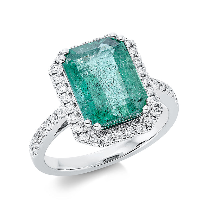 Ring 18 kt WG, 42 Brill. 0,37 ct, TW-vsi/si, 1 Smaragd 4,10 ct grün