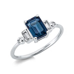 Ring 18 kt WG, 2 Bag. 0,09 ct, TW-si, 2 Brill. 0,03 ct, TW-si, 1 Topas 1,15 ct Lond. blue
