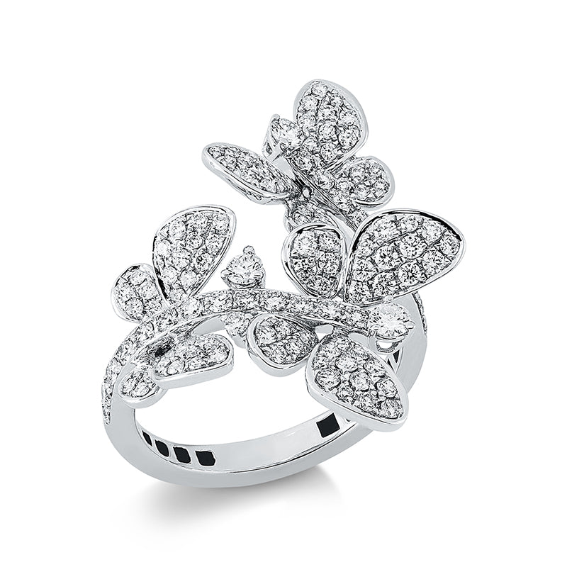 Ring 18 kt WG Schmetterling. 124 Brillanten 1.07 ct. TW-vsi. H:20.0 mm. B:25.9 mm. Weite:54