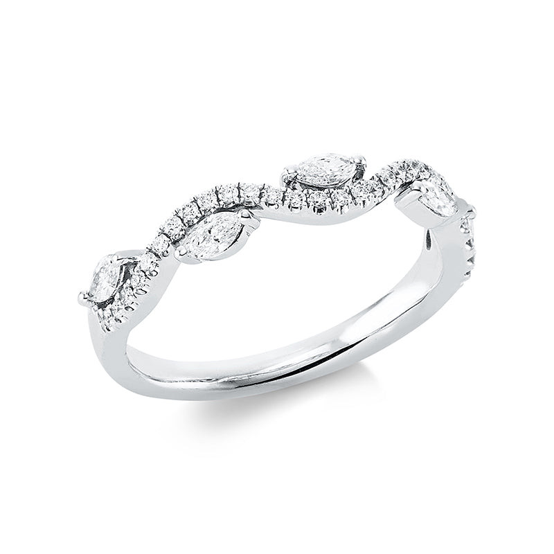 Ring 18 kt WG. 5 Navette 0.27 ct. TW-vsi. 29 Brillanten 0.15 ct. TW-si. B:3.6 mm. Weite:53.5