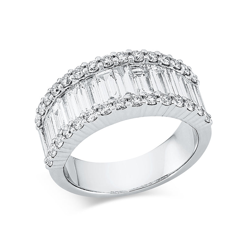 Ring 18 kt WG. 3 Baguette 0.20 ct. E-vsi. 13 Baguette 1.35 ct. E-vsi. 30 Brillanten 0.67 ct. TW-si. Weite:53