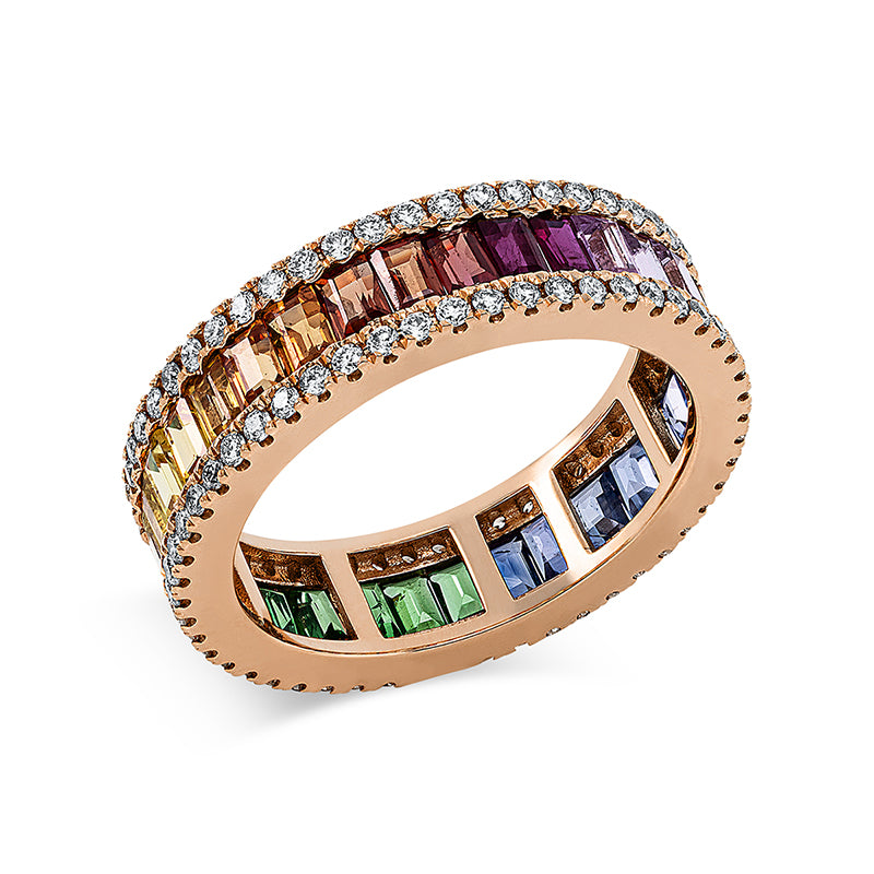 Ring 18 kt RG. 102 Brillanten 0.73 ct. W-si. 32 Saphire 3.33 ct multicolor. B:5.7 mm. Weite:54
