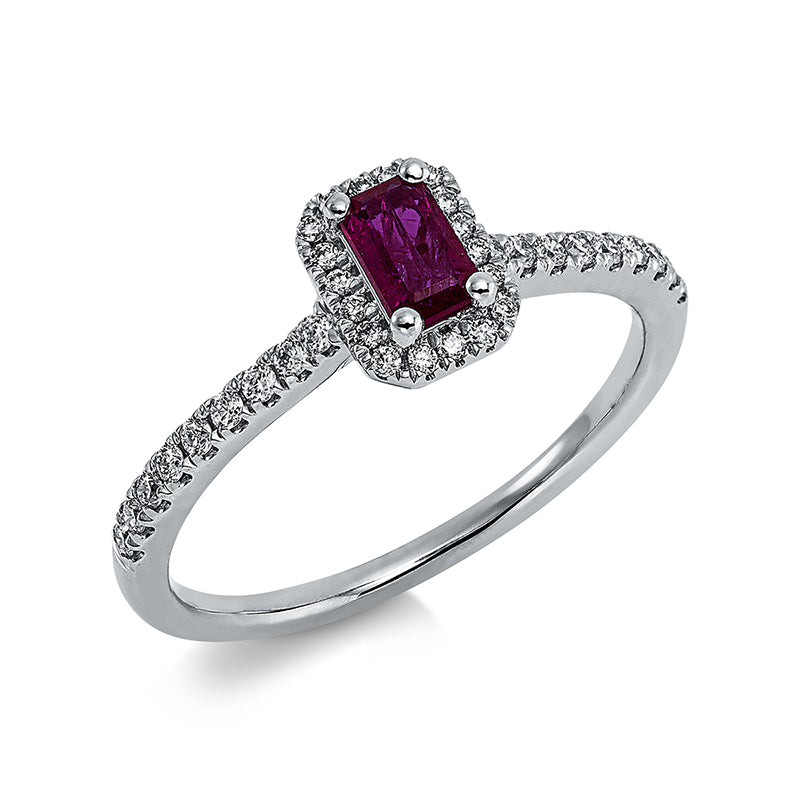 Ring 18 kt WG, 36 Brill. 0,20 ct, TW-si, 1 Rubin 0,30 ct rot