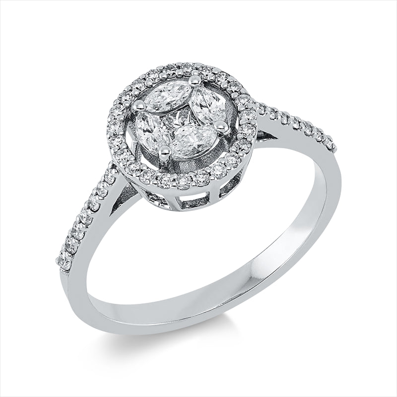 Ring 14 kt WG, 4 Nav. 0,20 ct, F-vsi, 1 Princ. 0,04 ct, F-vsi, 33 Brill. 0,21 ct, F-si