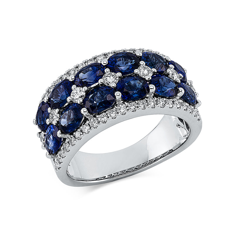 Ring 18 kt WG. 49 Brillanten 0.55 ct. TW-si. 12 Saphire 3.63 ct blau. Weite:53.5