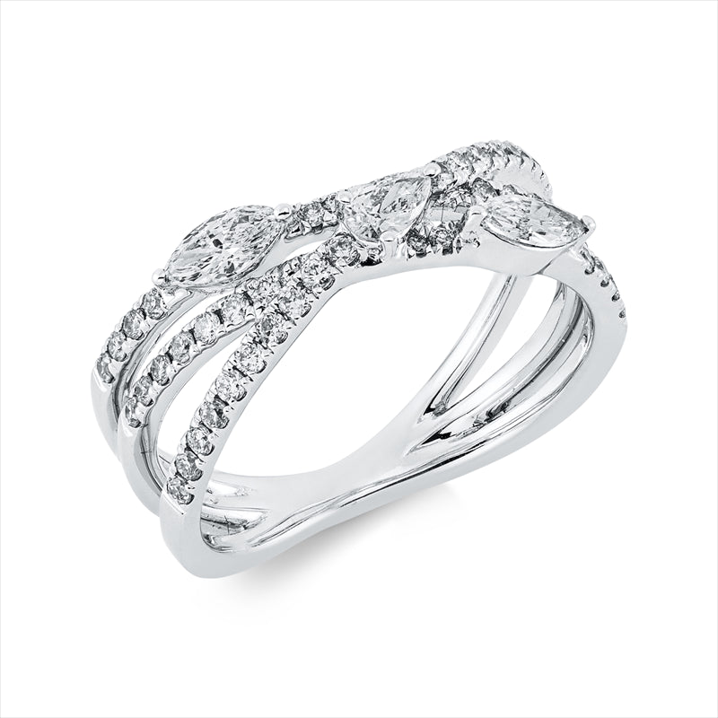 Ring 18 kt WG. 2 Navette 0.23 ct. TW-si. 1 Tropfen 0.09 ct. TW-si. 45 Brillanten 0.34 ct. TW-si. Weite:53