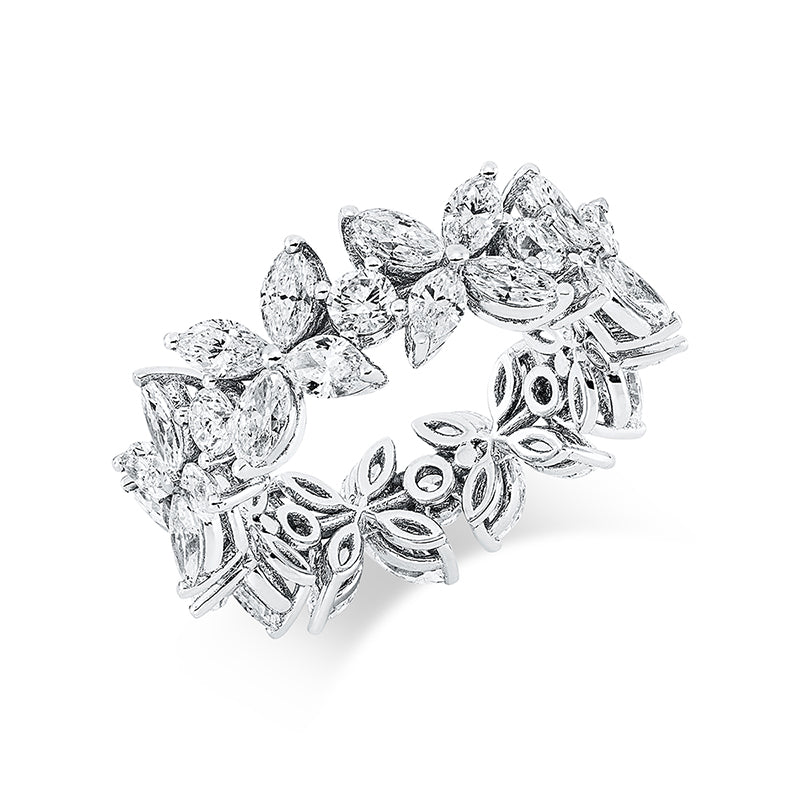 Ring 18 kt WG, 32 Nav. 3,10 ct, F-vsi, 8 Brill. 0,77 ct, F-si