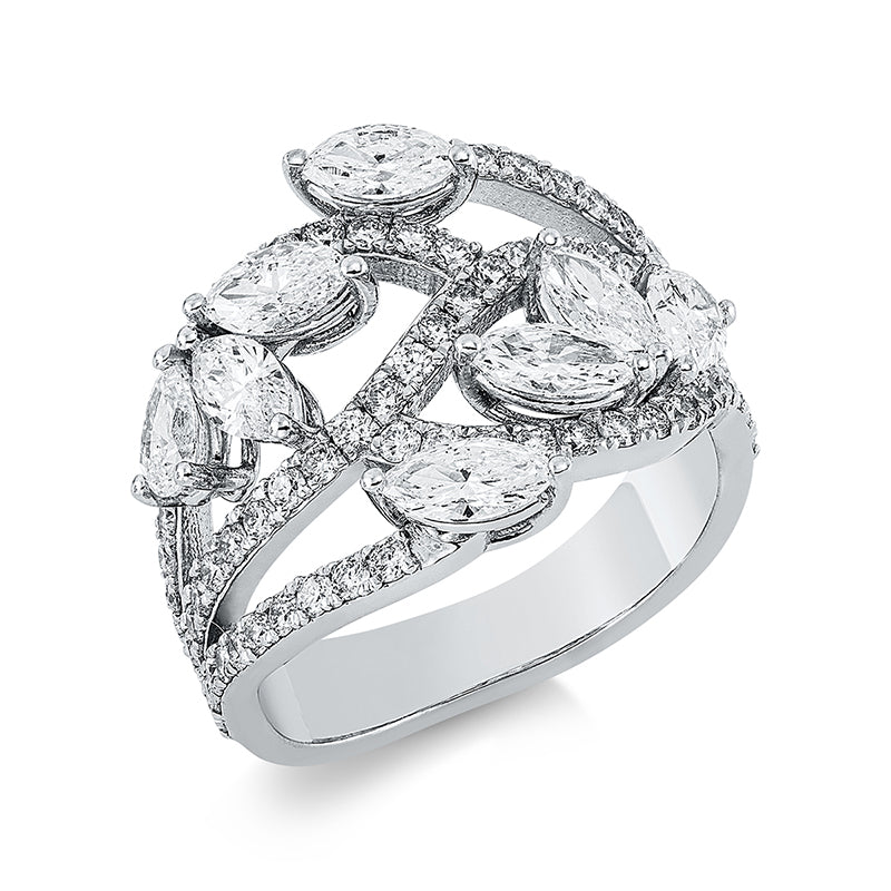 Ring 18 kt WG. 2 Tropfen 0.39 ct. F-vsi. 6 Navette 1.14 ct. F-vsi. 72 Brillanten 0.88 ct. F-si. Weite:54