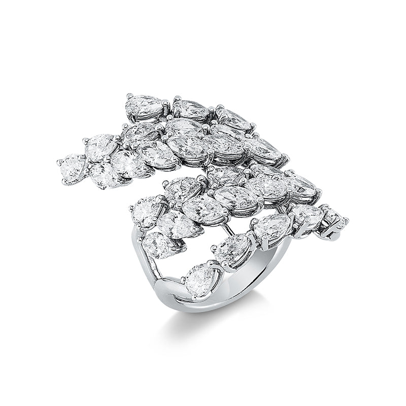 Ring 18 kt WG. 12 Navette 2.29 ct. F-vsi. 19 Tropfen 3.58 ct. F-vsi. Weite:54