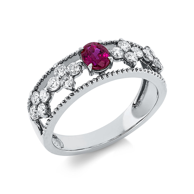 Ring 18 kt WG, 16 Brill. 0,48 ct, W-pi, 1 Rubin 0,34 ct rot