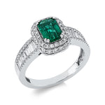 Ring 18 kt WG. 16 Baguette 0.33 ct. TW-si. 80 Brillanten 0.48 ct. TW-si. 1 Smaragd 0.94 ct grün. Weite:53