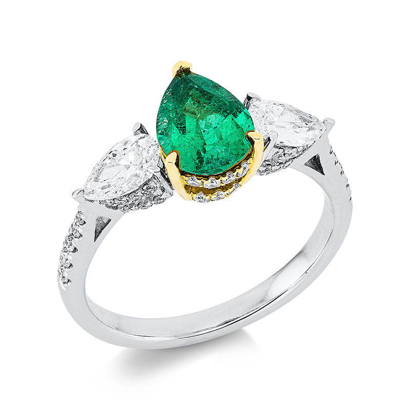 Ring 18 kt WG+GG, 2 Tropfen 0,64 ct, W-pi, 57 Brill. 0,28 ct, W-pi, 1 Smaragd 1,05 ct grün