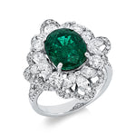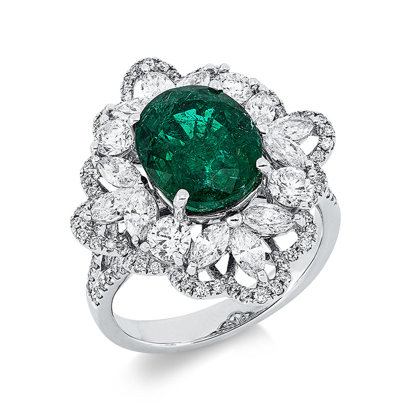 Ring 18 kt WG, 12 Nav. 0,92 ct, TW-vsi/si, 88 Brill. 0,86 ct, TW-vsi/si, 1 Smaragd 3,16 ct grün