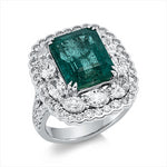 Ring 18 kt WG. 10 Oval 1.78 ct. TW-si. 58 Brillanten 0.96 ct. TW-si. 1 Smaragd 6.36 ct grün. Weite:53