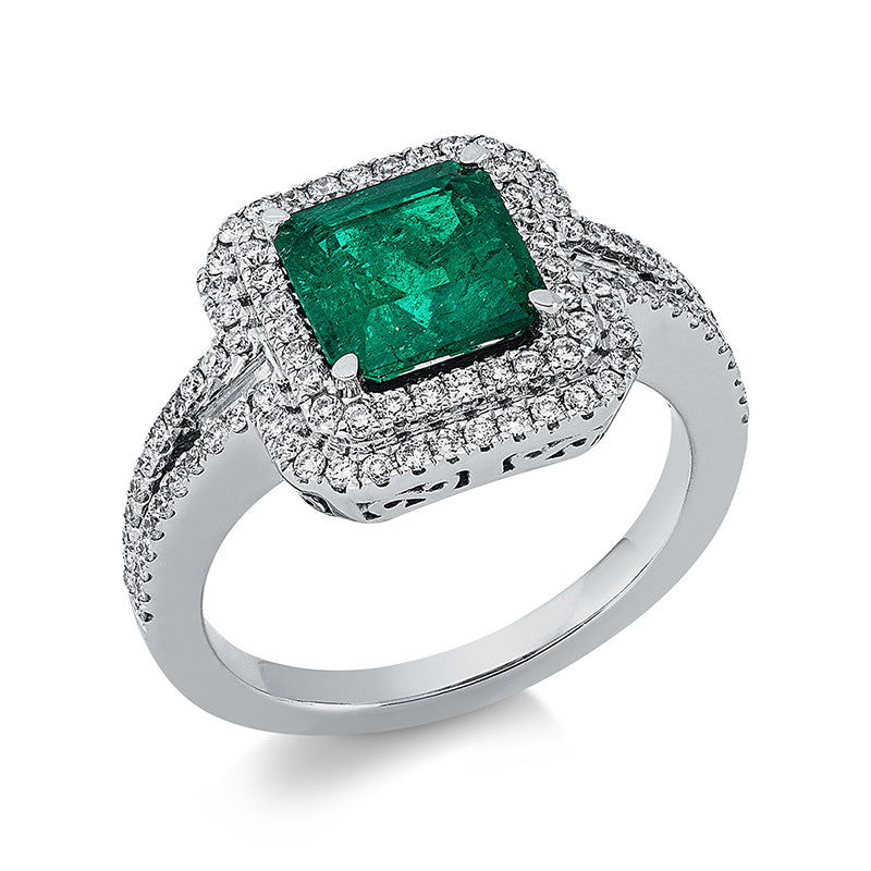 Ring 18 kt WG, 104 Fant-Schl. 0,56 ct, TW-si, 1 Smaragd 1,63 ct grün