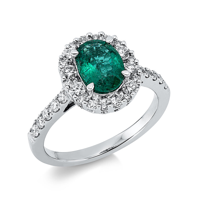 Ring 18 kt WG, 40 Brill. 0,77 ct, TW-si, 1 Smaragd 1,00 ct grün