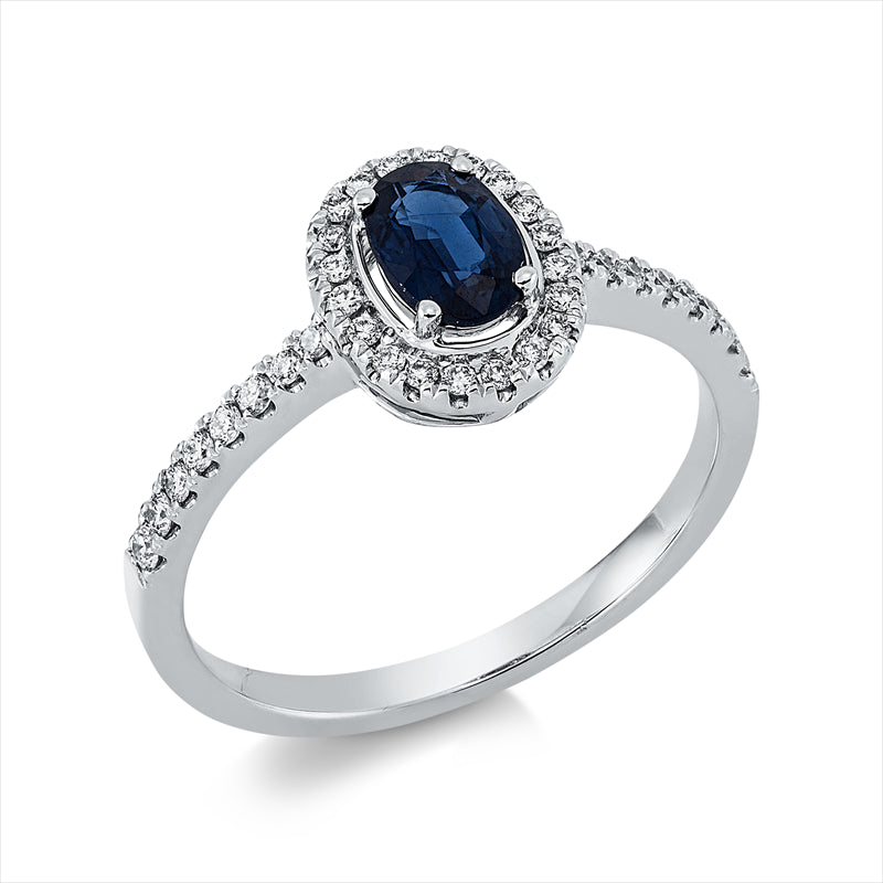 Ring 18 kt WG, 6 Brill. 0,06 ct, TW-si, 30 Brill. 0,15 ct, TW-si, 1 Saphir 0,56 ct blau