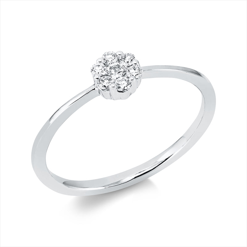 Ring 18 kt WG. 1 Brill. 0.06 ct. TW-si. 6 Brillanten 0.10 ct. TW-si. H:4.9 mm. B:5.1 mm. S:3.0 mm. Weite:54