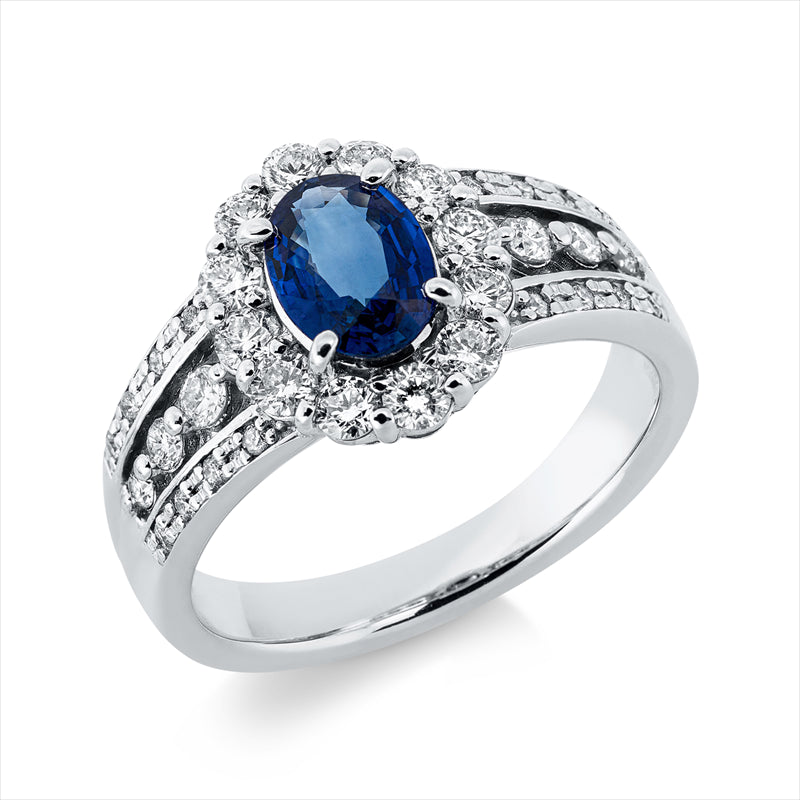 Ring 900 Pt Platin, 34 Brill. 0,70 ct, TW-si, 1 Saphir 0,85 ct blau