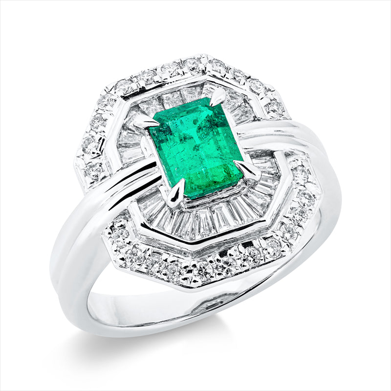Ring 900 Pt Platin, 42 Fant-Schl. 0,60 ct, TW-si, 1 Smaragd 0,75 ct grün