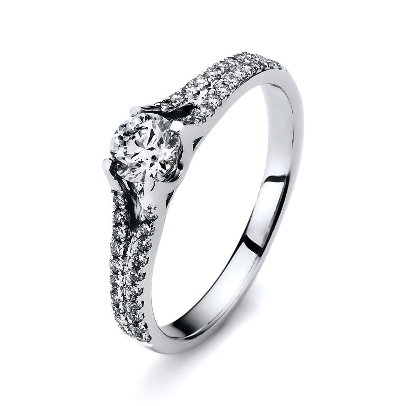 Ring 14 kt WG. 1 Brill. 0.31 ct. TW-si. 40 Brillanten 0.20 ct. TW-si. B:2.3 mm. Weite:55