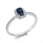 Ring 18 kt WG, 18 Brill. 0,25 ct, TW-si, 12 Brill. 0,06 ct, TW-si, 1 Saphir 0,42 ct blau