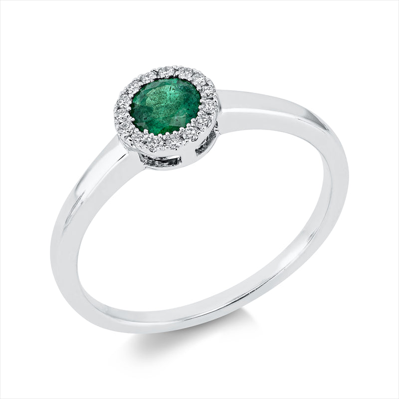 Ring 18 kt WG, 15 Brill. 0,07 ct, TW-si, 1 Smaragd 0,35 ct grün