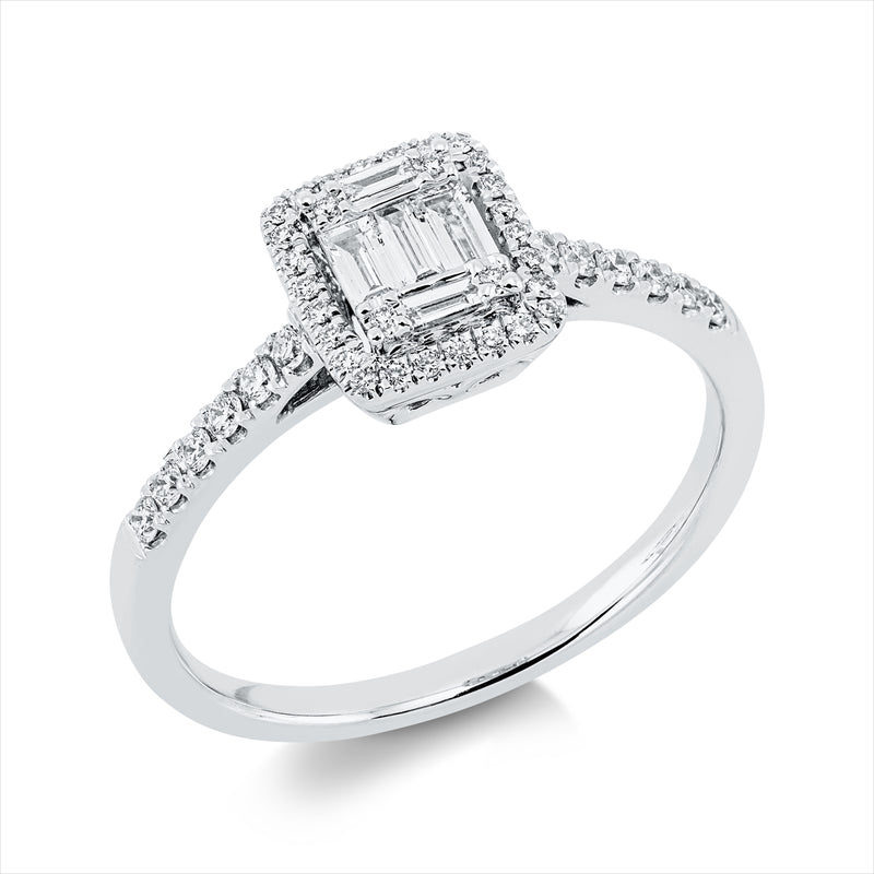 Ring 18 kt WG. 12 Brillanten 0.12 ct. TW-si. 2 Baguette 0.04 ct. TW-si. 3 Baguette 0.12 ct. TW-si. 30 Brillanten 0.08 ct. TW-si. Weite:54